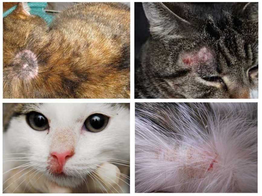 На теле кошки появляются красные пятна, в тех же местах локально повышается температура. Потом на воспаленных очагах проступают плотные пузырьки с прозрачной жидкостью (экссудатом) внутри. Эти образования могут рассасываться или вскрываться, инфицироваться и трансформироваться в гнойники, после вскрытия которых возникают корки. Через какое-то время они отпадают, и появляется здоровая кожа.