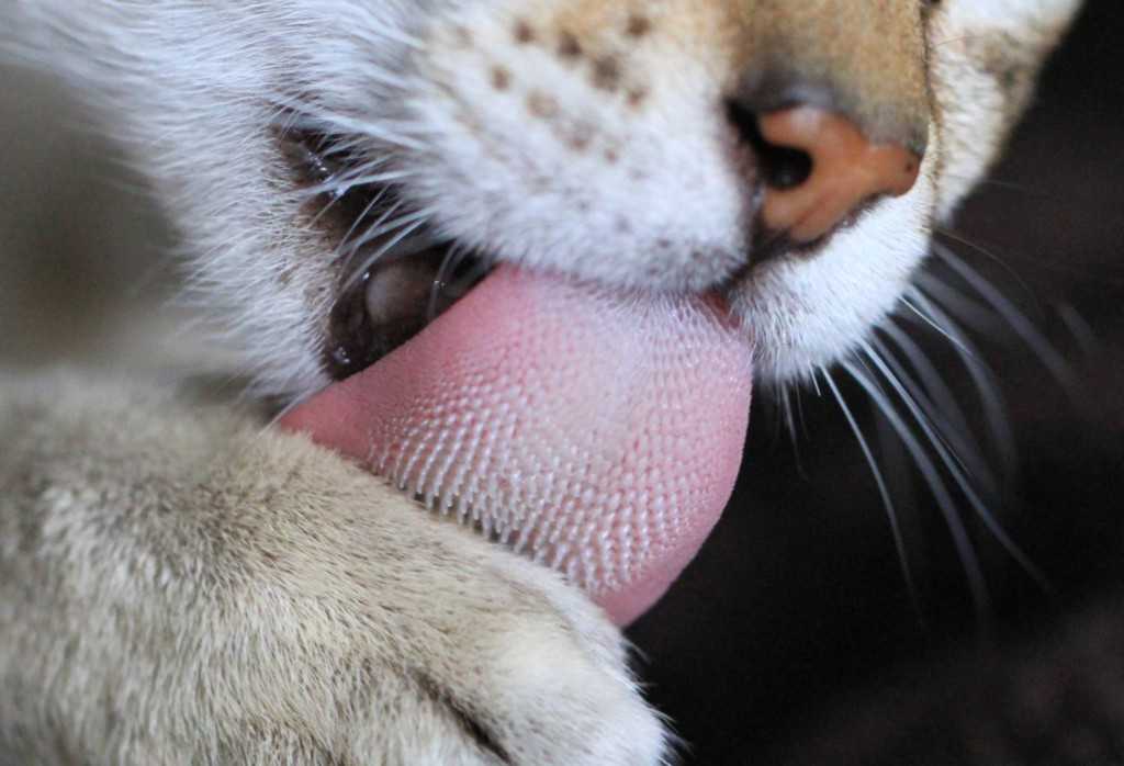 - кошка тяжело дышит, старается вытолкнуть языком изо рта несуществующую помеху;