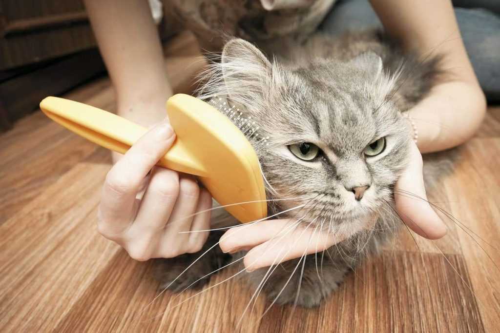 - Тщательное вычесывание кошки, особенно в период линьки. Длинношерстных животных следует вычесывать один раз в 1–2 недели. Так можно будет уменьшить количество шерсти, которое питомец проглотит при вылизывании.