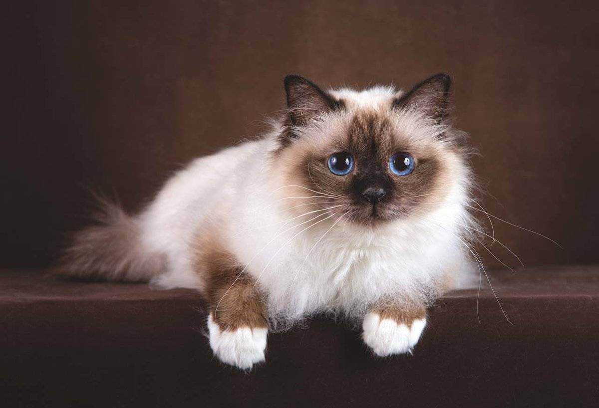 Бирманские кошки отличаются невероятной красотой – необычный окрас с белыми лапками, сапфирово-синие глаза. Классический окрас бирмы: цвет светлой части шерстки – светло-бежевый, темной – шоколадно-коричневый, однако, встречаются и другие типы окраса: