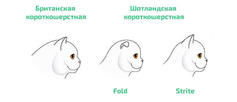| Уши | Прямые, стоячие, чуть закруглённые, поставлены под небольшим углом | Разновидность скоттиш-страйт имеет прямые уши, поставлены более вертикально, у скоттиш-фолд — уши загнуты (висячие) |