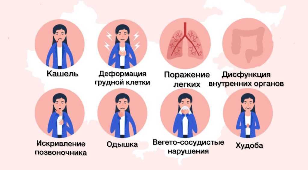 Встречаются такие расстройства, как пневмонии, бронхиты. Они потенциально способны спровоцировать эмфизему или хроническую обструктивную болезнь легких.