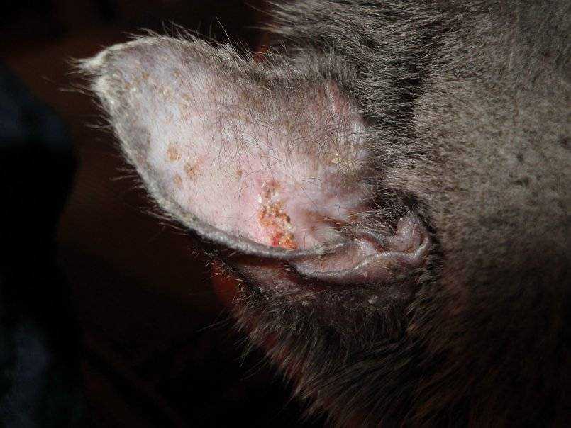 - Ушные клещи питаются ушной серой и кожным жиром. Их можно разглядеть в увеличительное стекло: светлые подвижные существа.Чесоточные клещи вызывают такой сильный зуд, что питомец будет расчесывать себя до крови. Кожа на пораженных участках может утолщаться, шелушиться и покрываться корочками.