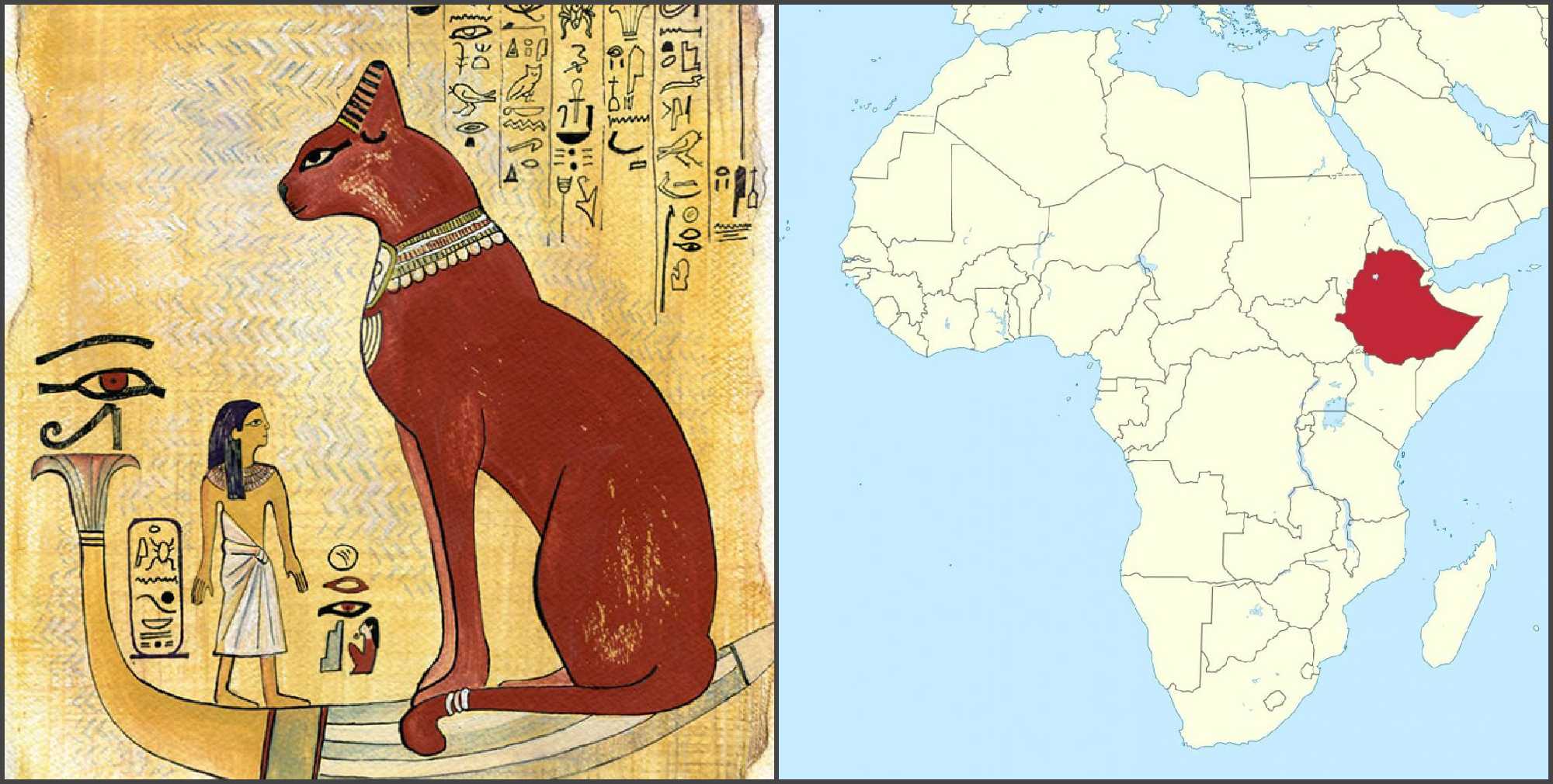 Абиссиния, она же – Эфиопия – древнее африканское государство. Территория страны стала перевалочным пунктом для европейцев на пути в Индию и Китай. Прибрежные земли были захвачены, в том числе – англичанами. Именно оттуда капитан Баретт-Ленард привез на родину необычного кота в 1874 году. Его звали Зула, и он зарегистрирован в племенной книге под звучным названием «абиссинская кошка». К сожалению, сведений о его потомках или других завезенных животных нет.
