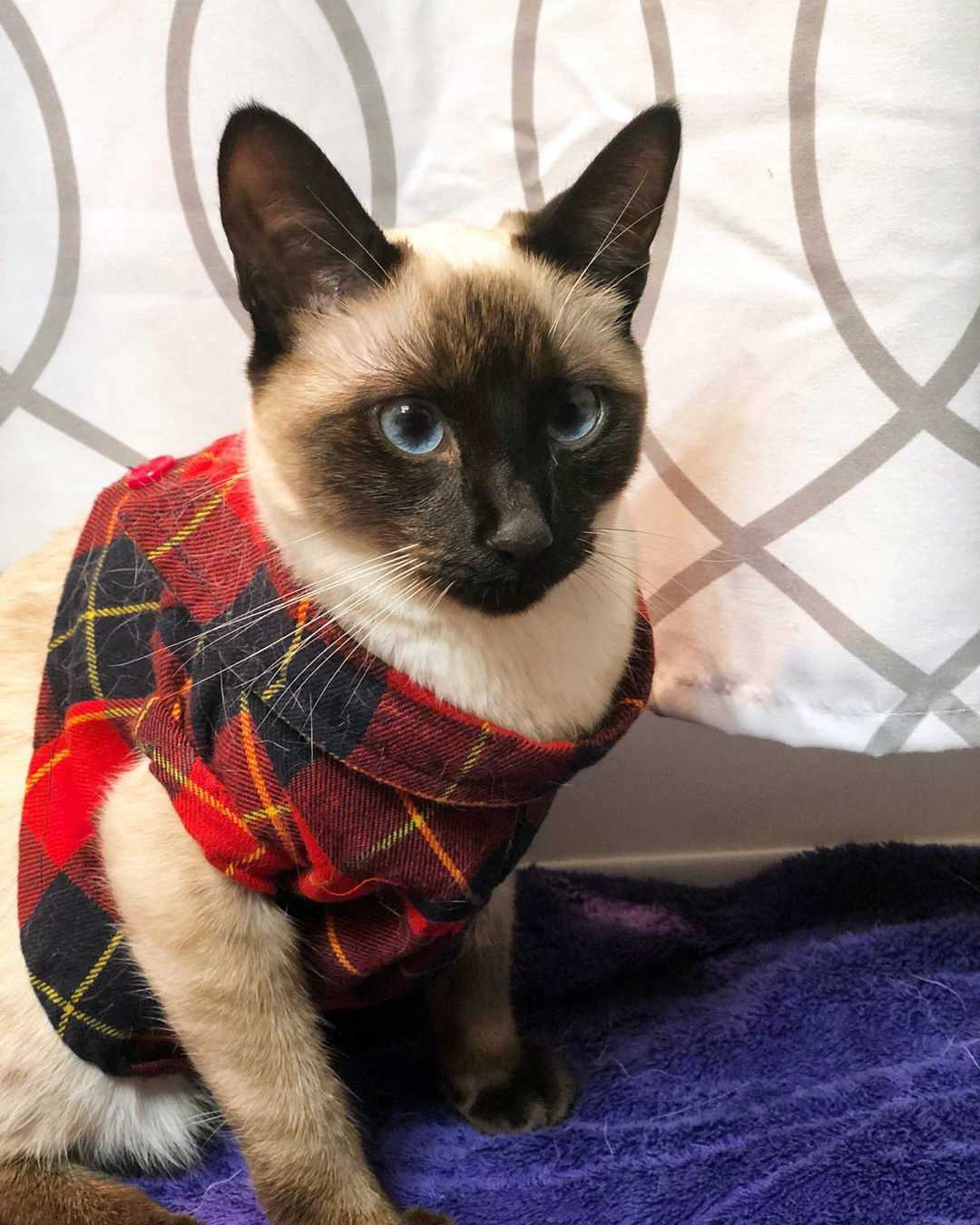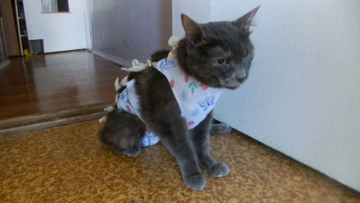 Чтобы кот не разлизывал швы, на него надевают специальный воротник или попонку
