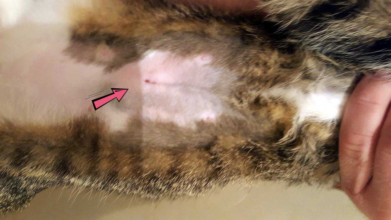 В первые сутки после операции кошка мало интересуется швом. Сильнее всего беспокойство на 3-4 день: начинает отрастать выбритая шерсть, начинает чесаться и заживающий шов. Кошка может пытаться лизать животик через ткань.