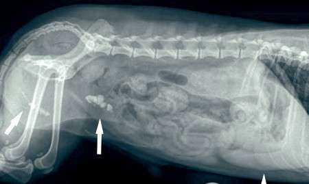 Очень часто себя никак не проявляют нефролиты (камни, находящиеся непосредственно в почечной лоханке), но это справедливо только для тех случаев, когда патология не сопровождается пиелонефритом, или когда камни не «протискиваются» в мочевыводящие протоки. Последняя ситуация, кстати, особенно тяжела. Она сопровождается рвотой, вероятно развитие летаргии, почечных колик. В случае, когда камень достаточно крупный и проявляет тенденцию к разрастанию, он начинает буквально растягивать и рвать почечную лоханку. Боль при этом настолько сильная, что животное может погибнуть от болевого шока. Даже если его болевой порог окажется высоким, питомец все равно рискует погибнуть от мощного внутреннего кровотечения.