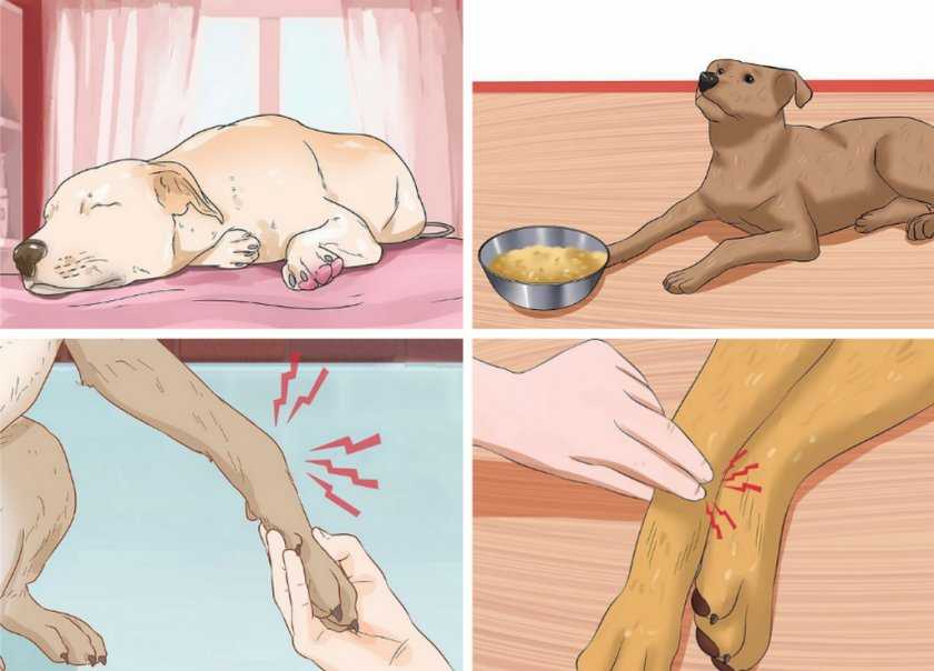 - собака становится мало активной, часто лежит;