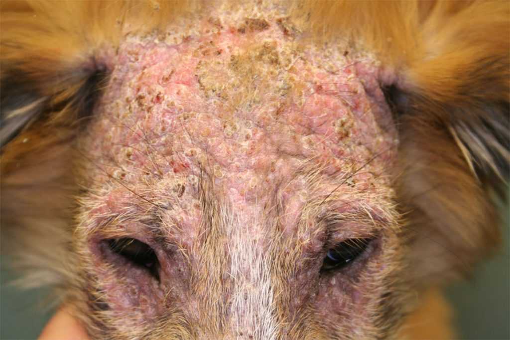 заболевших собак. В данном случае появляются обширные очаги поражения, причем