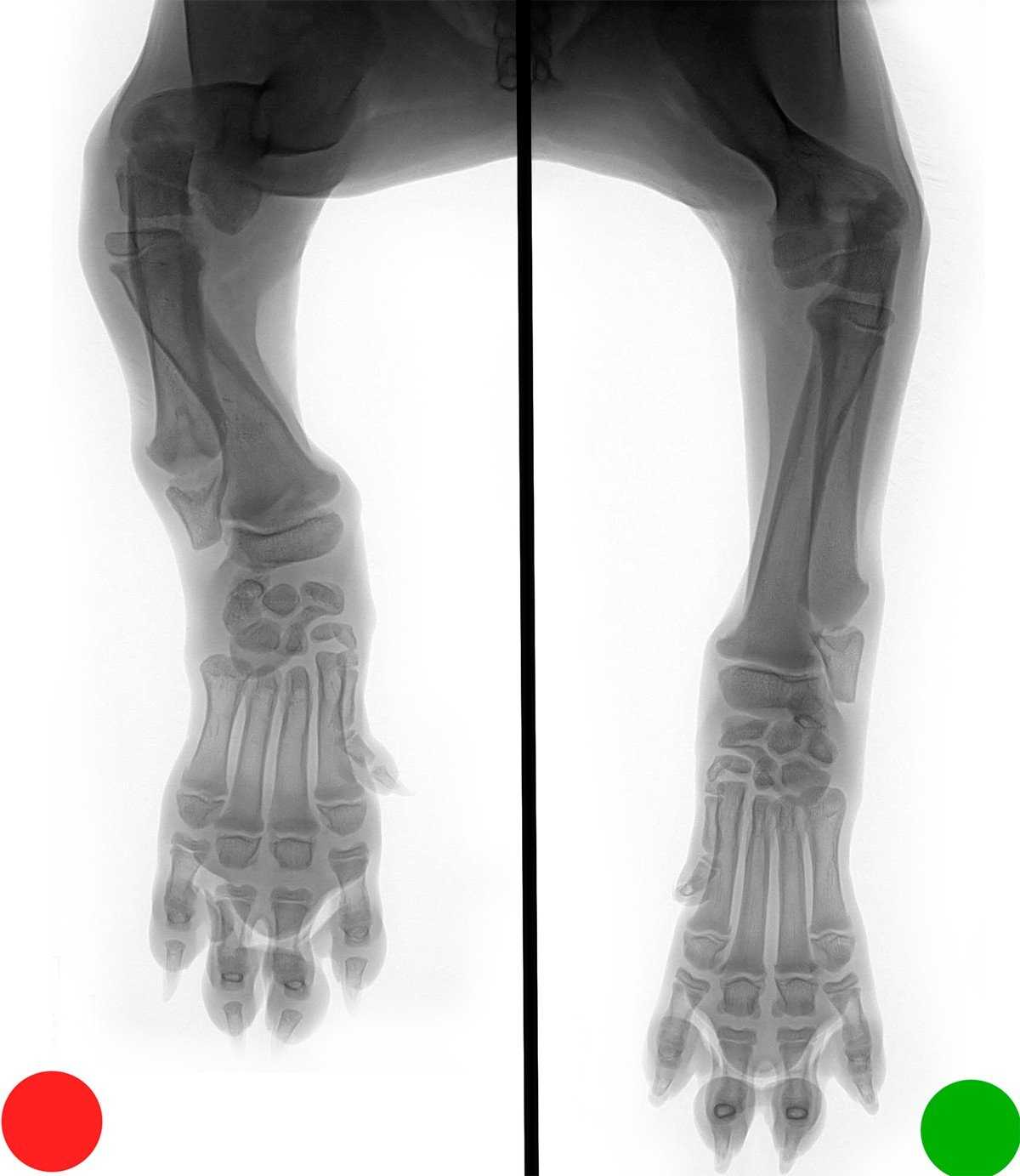НО! Если преждевременно заканчивает рост только одна из костей предплечья, в этом случае щенка ждут боли и страдания. Поскольку вторая продолжает расти, она со временем искривляется, часто ломается. Страдают суставы, мышцы, вся лапа собаки. В этом случае можно помочь только хирургическим вмешательством.