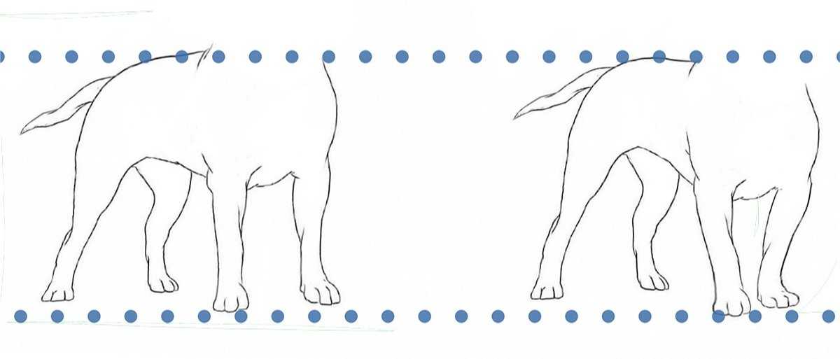 Посмотрите на рисунок. Это одна и та же собака, но на втором изображении она сблизила передние лапы, что слегка опустило ее переднюю часть, а значит перенесла центр тяжести чуть вперед, разгрузив при этом задние лапы. Точно также молодая собака контролирует центр тяжести наклоном передних лап, если задние слишком далеко отставлены.