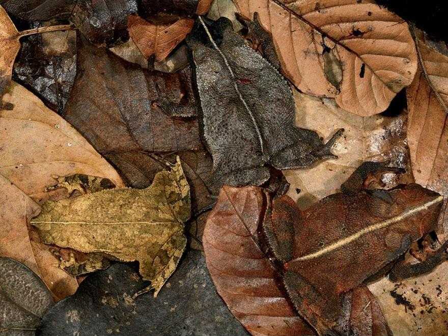 Листохвостый геккон, ещё одно животное умеющее маскироваться в живой природе. На фоне листьев он абсолютно незаметен. Ведет ночной образ жизни и обитает на деревьях и кустах. Днем часами сидит неподвижно, притворяясь листьями. Для защиты от хищников, он может изменять форму и цвет своего тела, все это зависит от листвы, в которой он обитает. Гекконы могут быть красными, желтыми или бурыми, но всегда будет присутствовать коричневый оттенок. Так же они имеют невероятно хорошее зрение, позволяющее охотиться в ночное время суток. Когда к животному слишком близко подбирается хищник, оно начинает издавать громкие звуки и открывает ярко-красную пасть, что дает возможность отвлечь противника и скрыться в листве.