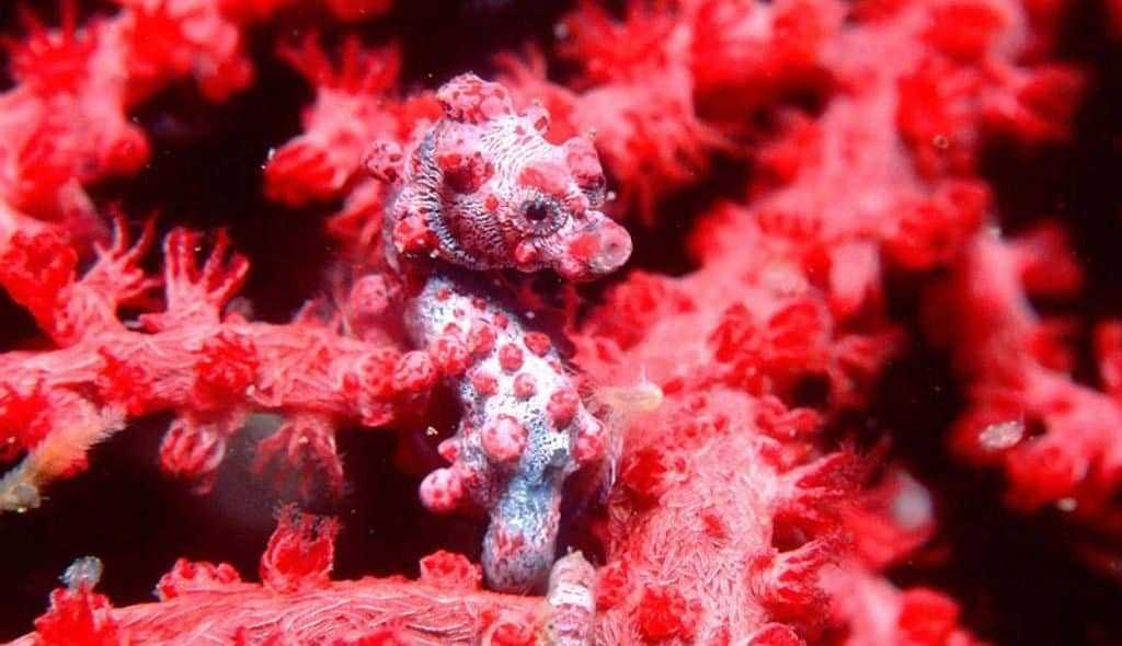 Розовая неоднородная окраска полностью имитирует частицы кораллов. Кроме того, морской конёк, который достигает в длину не более 1,6 см, покрыт не чешуёй, как большинство рыб, а особыми пластинами с выростами, точно повторяющими по внешнему виду фактуру кораллов. За счёт таких приспособлений тело карликового морского конька полностью сливается с окружающей средой, что позволяет животному сохранить не только свою жизнь, но и спрятать детей от всевозможных опасностей.