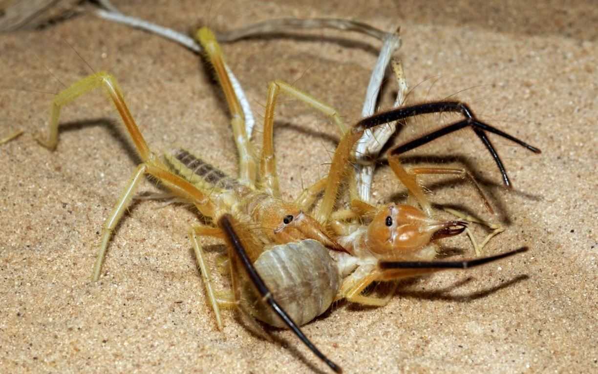 После удачного оплодотворения самка начинает активно питаться, набирая массу. Затем она выкапывает нору, где откладывает несколько десятков яиц и засыпает их песком. Через 14-20 дней из яиц вылупляются маленькие сольпуги с розовым полупрозрачным панцирем.