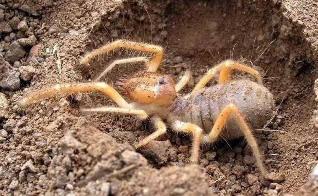 У сольпуги четыре пары членистых ног, на кончиках которых расположены сучковые органы с прилипающими свойствами, благодаря чему фаланга может свободно лазать по вертикальным поверхностям, по стенам и даже по потолку. Спереди у неё имеется еще пара конечностей, так называемых педипальп, похожих на ноги но исполняющих роль щупальцев которыми она пользуется как руками.