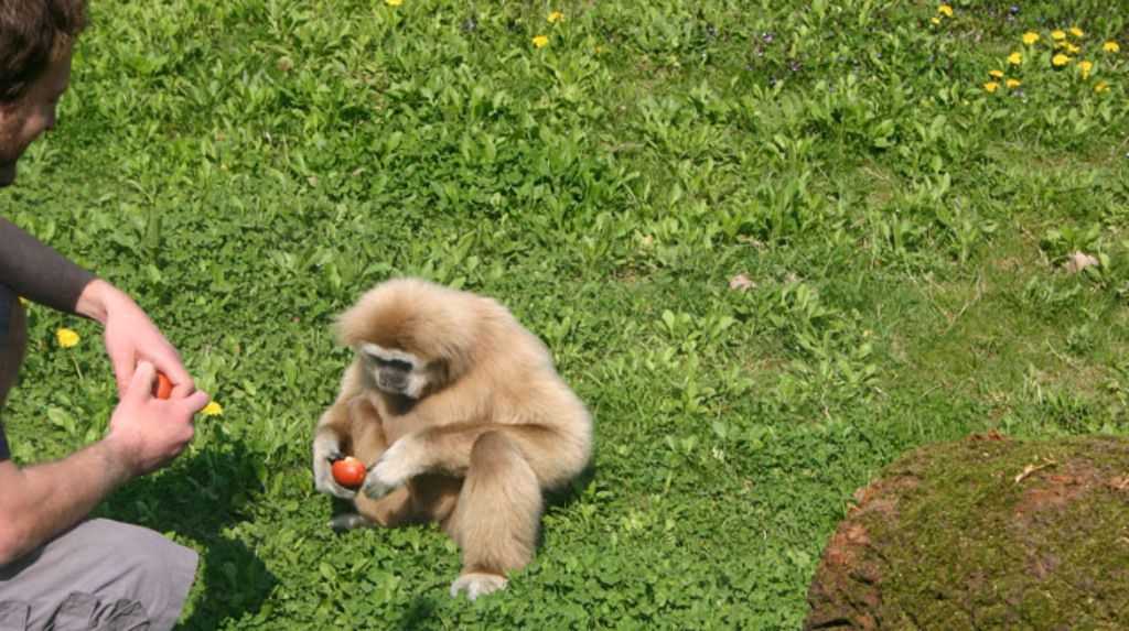 Гиббоны в зоопарке получают разнообразные фрукты, овощи, зеленые ветки, яйца, творог.
