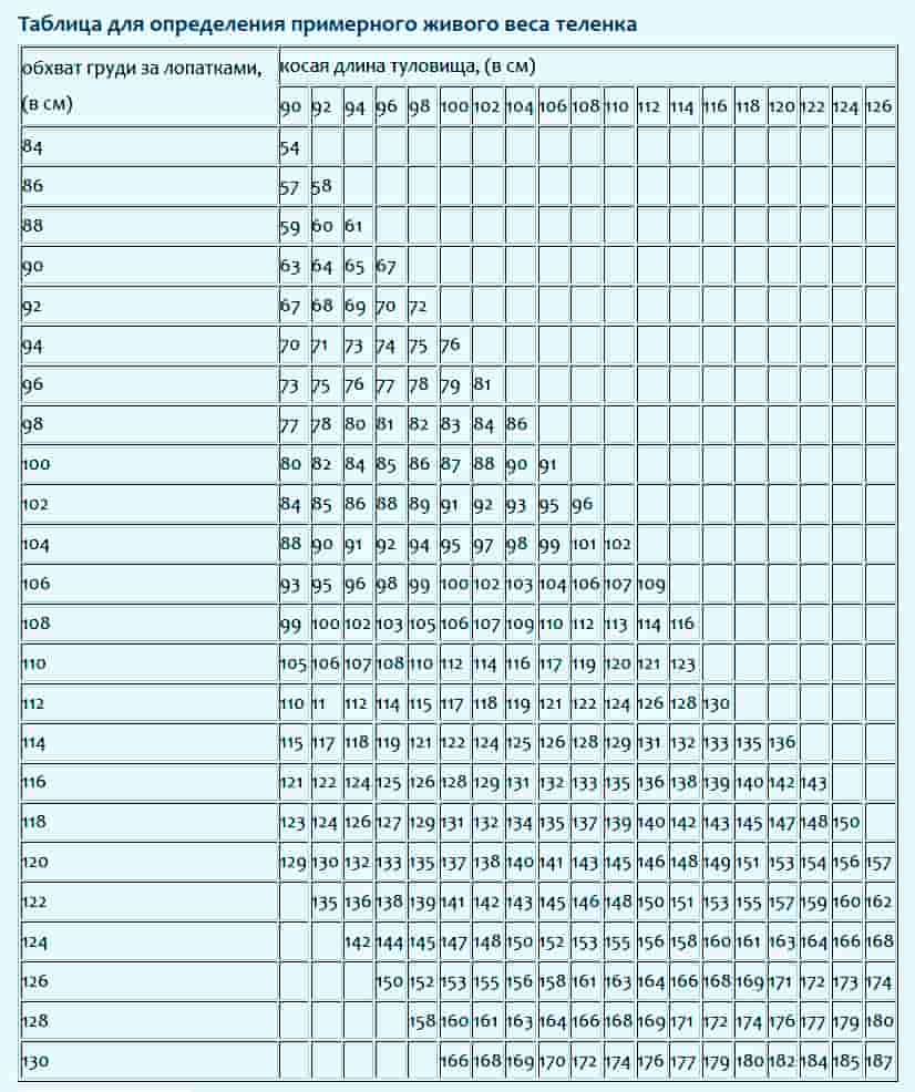Чтобы узнать, сколько весит в 1 год живым весом бык, можно замерить самую объемную часть в области обхвата груди. Результат сравнивают с данными таблицы, причем она будет отличаться для каждой породы коров.