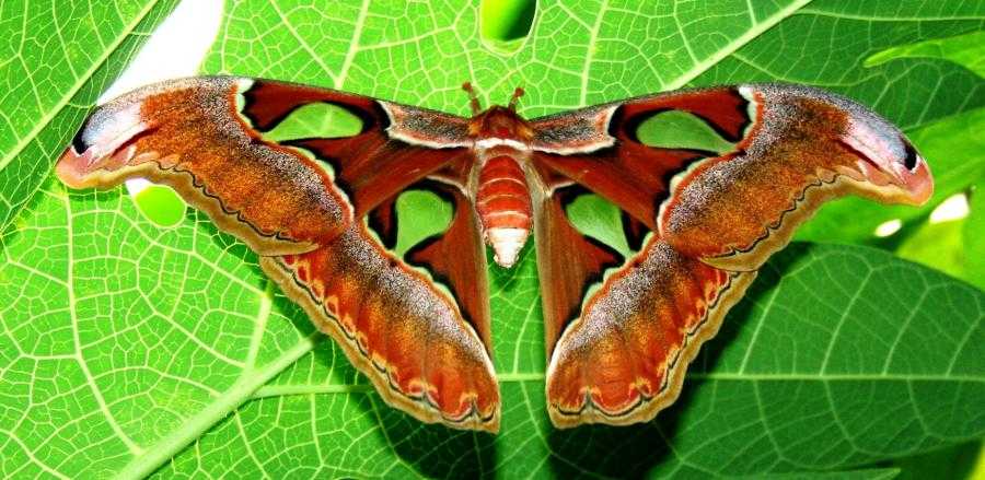- Одна из самых крупных и необычных по своему строению бабочек – Павлиноглазка Атлас. Её передние крылья изогнуты и напоминают голову змеи. Так она отпугивает врагов и спокойно ведёт дневной образ жизни.