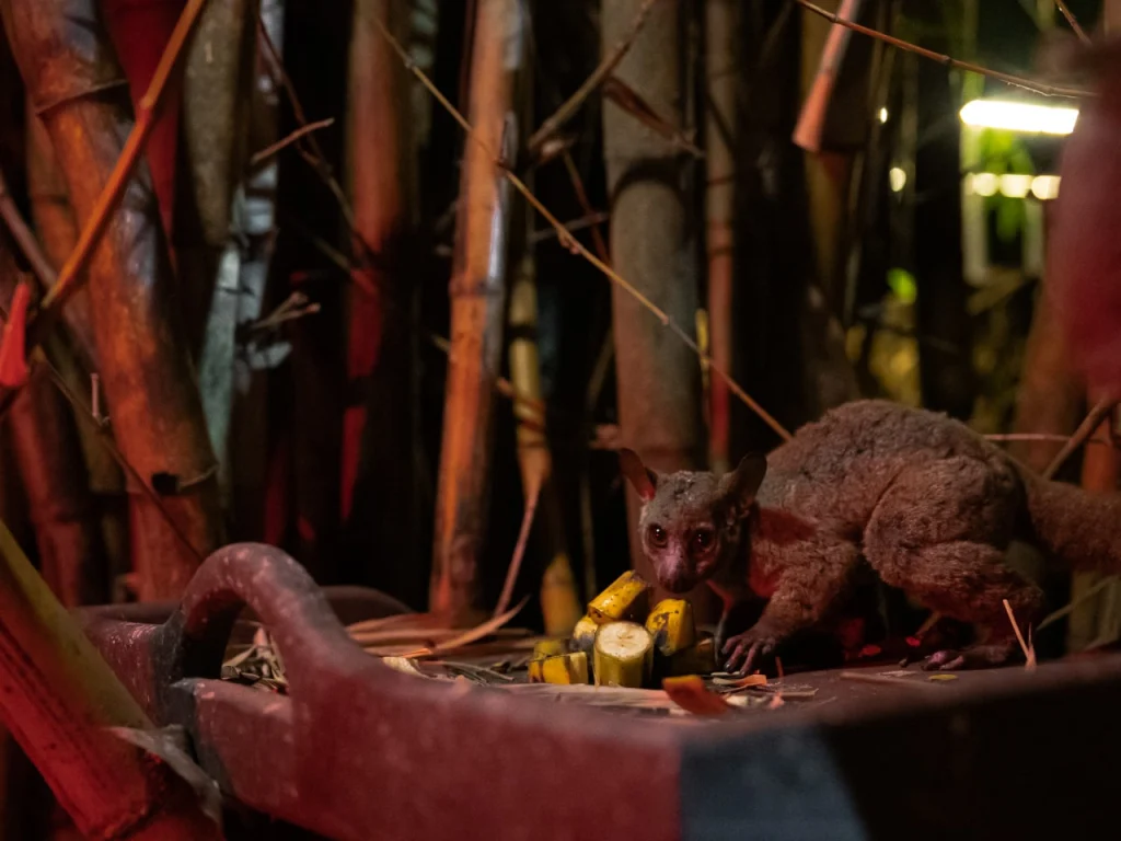 Послушать и даже записать разнообразные крики бушбеби можно поздним вечером и ночью. Для этого не обязательно выходить на улицу, достаточно подойти к окну. А чтобы увидеть этих большеглазых крох, надо подкараулить их под зарослями бамбука и невысоких деревьев между прудом и рестораном. В этом месте находится точка кормления галаго, куда по вечерам официанты приносят фрукты для животных. Нужно быть готовым к тому, что юркий зверек быстро спустится с дерева, возьмет угощение и снова исчезнет в зарослях. Но некоторым везет на смелых бушбеби, и тогда получается понаблюдать за ними подольше и даже сделать несколько фотографий.