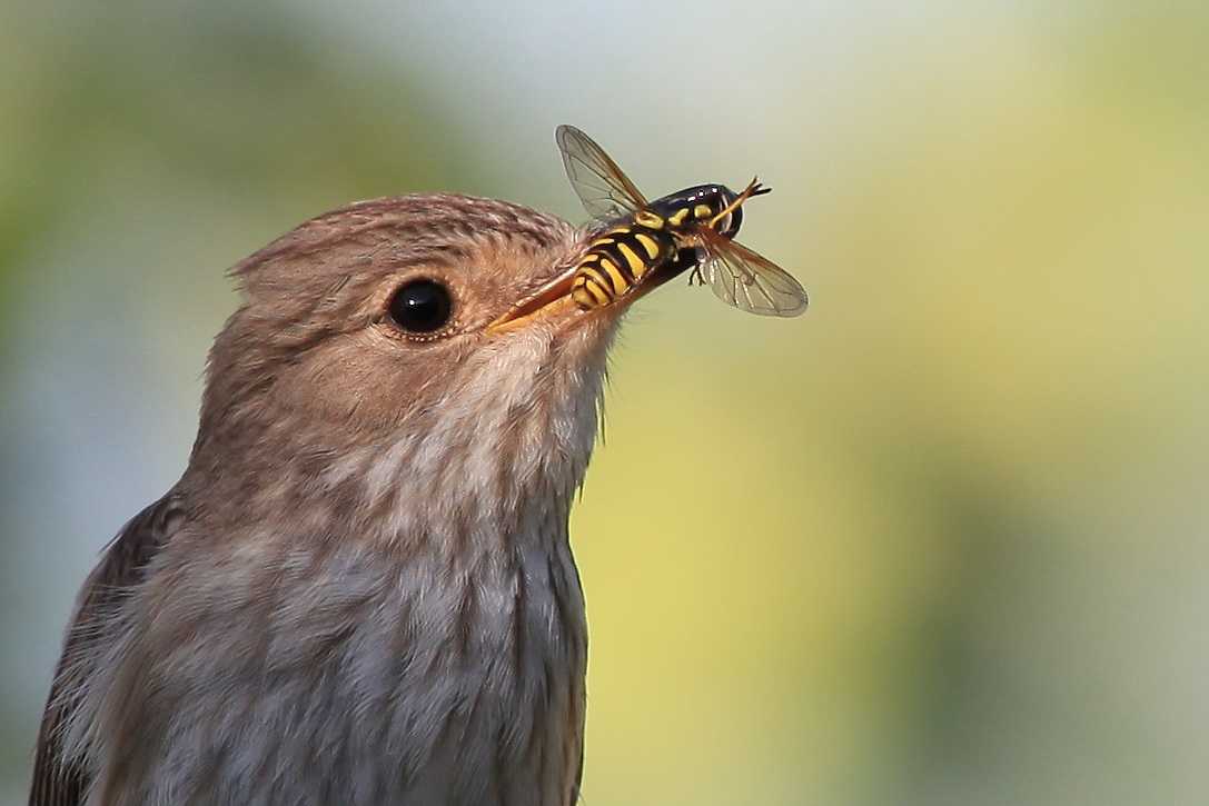 На рацион и общий характер питания этих птиц указывает их название. Мухоловки – ловкие и азартные ловцы мелких насекомых: мух, стрекоз, бабочек. Охотятся птицы своеобразно: пичуга занимает удобное место на ветке, так чтобы листва ее прикрывала, и периодически подскакивает наверх, хватает пролетающую мимо муху и возвращается обратно в засаду. Следует отметить, что мухоловки ловят не только мух.
