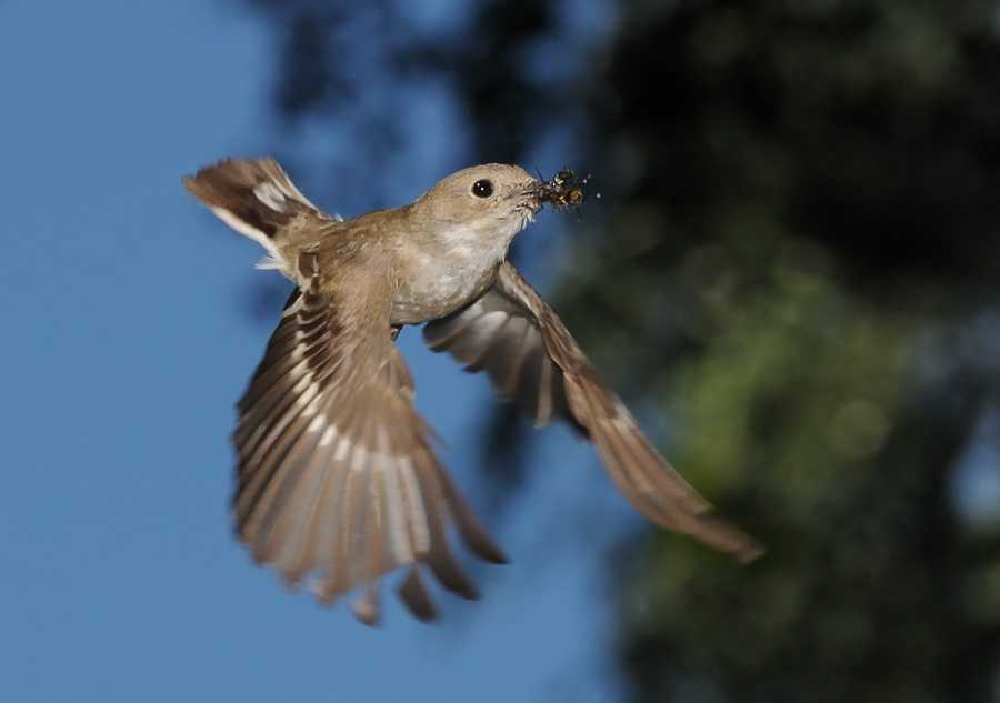 Но если погода не дает мухоловке летать, птичка находит в листве деревьев для себя жуков, муравьев или пауков. Кроме того, эта птаха питается плодами фруктовых и ягодных растений.