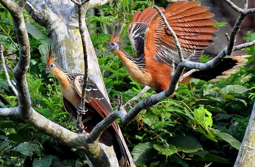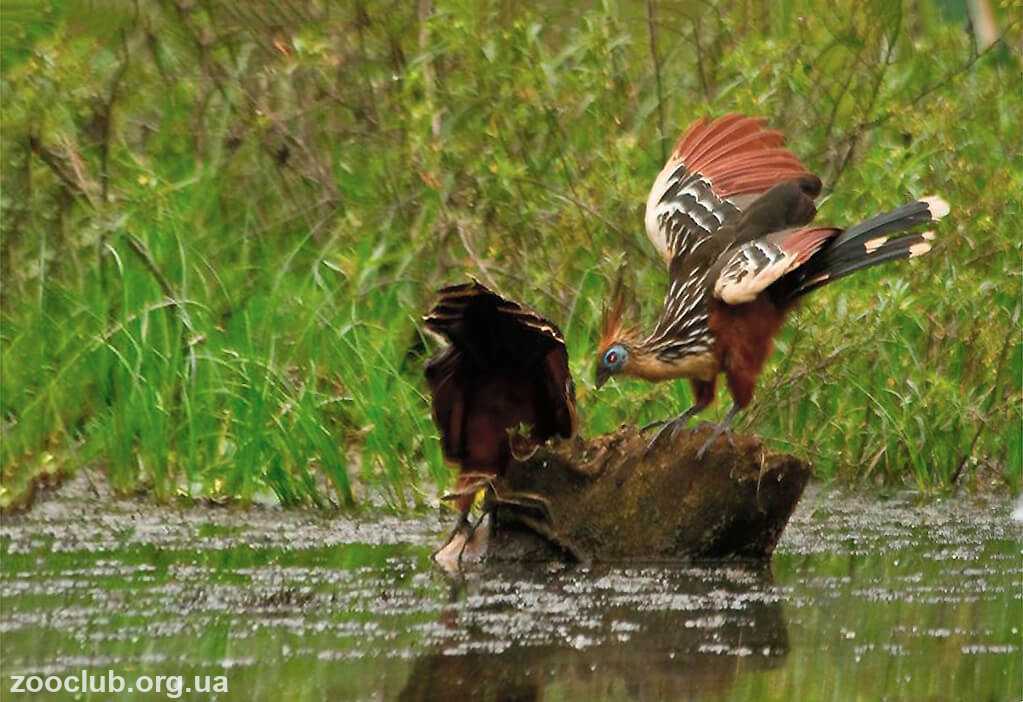 Добравшись до родного куста, они выкарабкиваются из реки или озера и шустро, как маленькие обезьянки, лезут наверх, домой. И при этом используют не только лапы и клюв, но еще и… коготки, растущие на пальцах крыла. Кстати, именно из-за этих пальцев в свое время гоацинов относили к кукушкообразным: у таких птиц птенцы появляются из яиц, имея на крыльях редуцированные пальцы. Когда молодые гоацины становятся на крыло, дополнительные пальцы становятся ненужными и постепенно утрачиваются, напоминая о себе лишь небольшими бугорками на месте прежнего расположения. Теряют птицы и умение плавать. Во всяком случае, к воде они подходят лишь тогда, когда желают напиться.