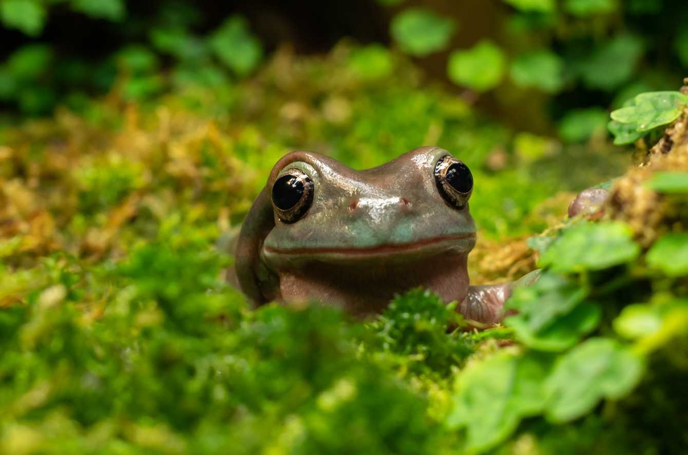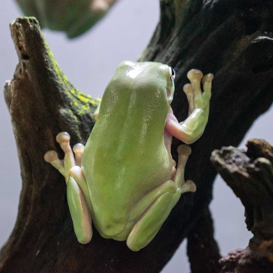 Лягушка австралийская квакша. На дне террариума должна находиться емкость с отстоянной и отфильтрованной водой, прогретой до 26-28°С