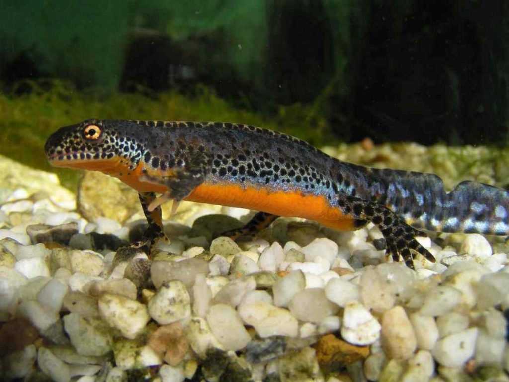 Краснобрюхий тритон. Крупная особь – до 20 см в длину с мощными лапами, выходец из тритонов калифорнийских. Стройное тельце без гребня, мордочка заужена. Кожные покровы бугристые, бородавчатые. В них содержится тетрадотоксин, яд который парализует дыхательную систему, но защищает земноводное от хищников.