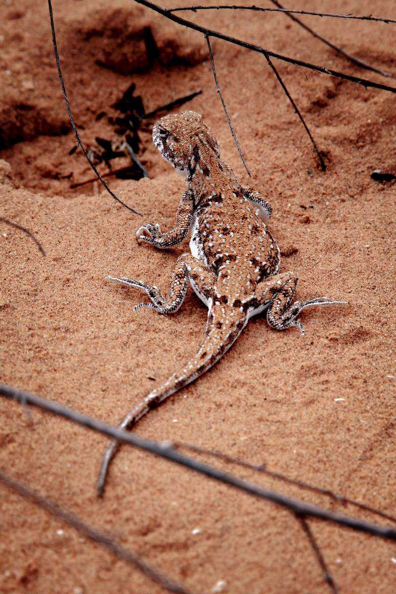 КРУГЛОГОЛОВКА ПЕСЧАННАЯ (Phrynocephalus interscapularis) редко превышает 80 мм в длину вместе с хвостом. Отличительными признаками ее, помимо малой величины, является приплюснутый на всем протяжении хвост и наличие по сторонам его основания, а также на заднем крае бедер бахромы из небольших белых зубчатых чешуек. Сверху эта ящерица песочно-желтого цвета с густым узором из темных и светлых точек и охристых или коричневых пятнышек. На спине, чуть пониже лопаток, расположено обычно розоватое или ржаво-охристое пятно, окруженное лиловой каймой. Нижняя сторона тела чисто-белая с 2—4 резкими черными полосами поперек средней части хвоста, тогда как конец его снизу угольно-черный. В отличие от предыдущего вида песчаная круглоголовка населяет не только барханные, но также и развеянные участки бугристых песков, предпочитая, однако, места, почти полностью лишенные растительности. Норка ее представляет собой простой, несколько наклонный ход длиной до 15 см, который ящерица в течение нескольких минут отрывает каждый раз заново, уходя на ночевку. «Выскочившая из песка песчаная круглоголовка,— пишет В. Фаусек — мчится по голой поверхности песчаного бархана с чрезвычайной быстротой… Остановившись, она не принимает никаких мер, чтобы присутствие ее было незаметно… Животное, спина которого совершенно песочного цвета, не прижимается к земле, а, напротив, возможно высоко поднимается на передних, а иногда и задних ногах, поднимая вверх голову. Белое брюхо, по бокам тела резкой чертой отграниченное от песчаного цвета спины, выдается и бросается в глаза. При этом ящерица не стоит смирно, а производит быстрые движения хвостом, закручивая его вверх к спинной стороне и сейчас же раскручивая снова и делая от времени до времени загнутым хвостом резкие движения налево и направо. Нижняя сторона хвоста с черными поперечными полосками, разделенными белыми промежутками, при быстрых движениях его образует резко бросающееся в глаза яркое пятно… Когда фриноцефал стоит в своей позе угрозы на песке, закручивая и раскручивая хвост, то… одновременно делает быстрое движение стопой одной из ног, отбрасывая ею назад щепотку песка. Расположение пальцев в форме граблей и служит, очевидно, для этого метанья песка. Постояв немного, ящерица с такой же стремительной быстротой бежит дальше, а затем наконец — останавливается и с чрезвычайной быстротой при помощи боковых движений тела закапывается в песок. Тогда она действительно мгновенно исчезает из глаз… и лежит неподвижно, хотя засыпана лишь очень тонким слоем песка». Поднятие и закручивание хвоста песчаными круглоголовками служит для сигнализации другим особям о своем присутствии. «Яркая пестрая окраска нижней стороны хвоста,— пишет Н. В. Шибанов, — служит им для опознавания друг друга. Я неоднократно наблюдал в их поведении то, что, вероятно, правильно будет назвать брачными играми. Через небольшие промежутки времени одна из ящериц, чаще самка, закапывается наполовину или полностью в песок. Другая сразу же останавливается и, подергивая закрученным над спиной хвостом, осматривается по сторонам. Но вот зарывшаяся приподнимает из песка голову и вскидывает над спиной ярко-белый полосатый хвост, резко выделяющийся на фоне песка. Заметив «сигнал», вторая круглоголовка немедленно подбегает к первой, и «игра» возобновляется