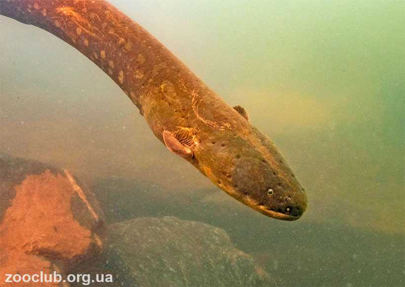 Электрический угорь имеет довольно большие размеры – средняя длина тела составляет 2-2,5 метра, а некоторые особи достигают 3 метра.