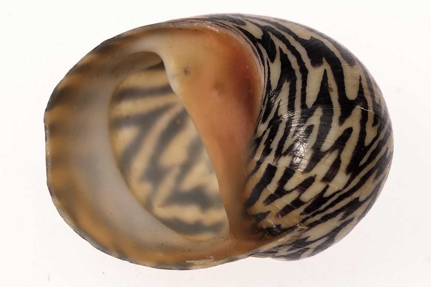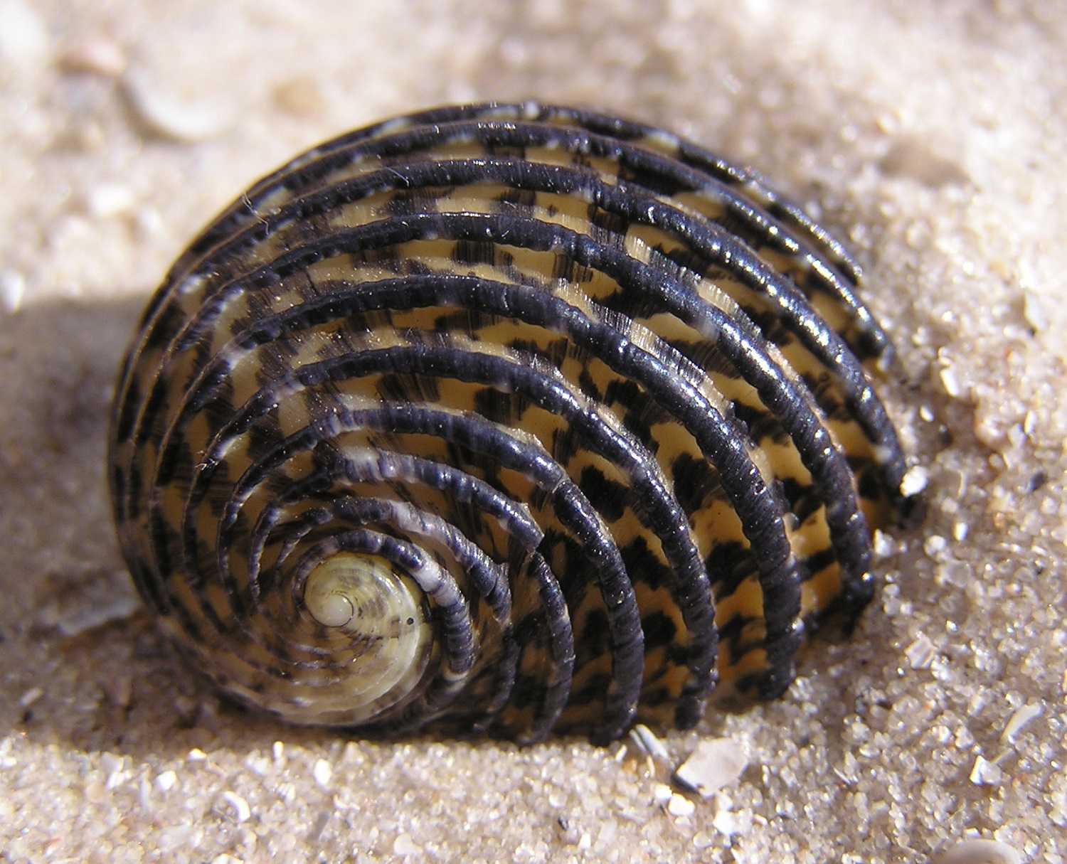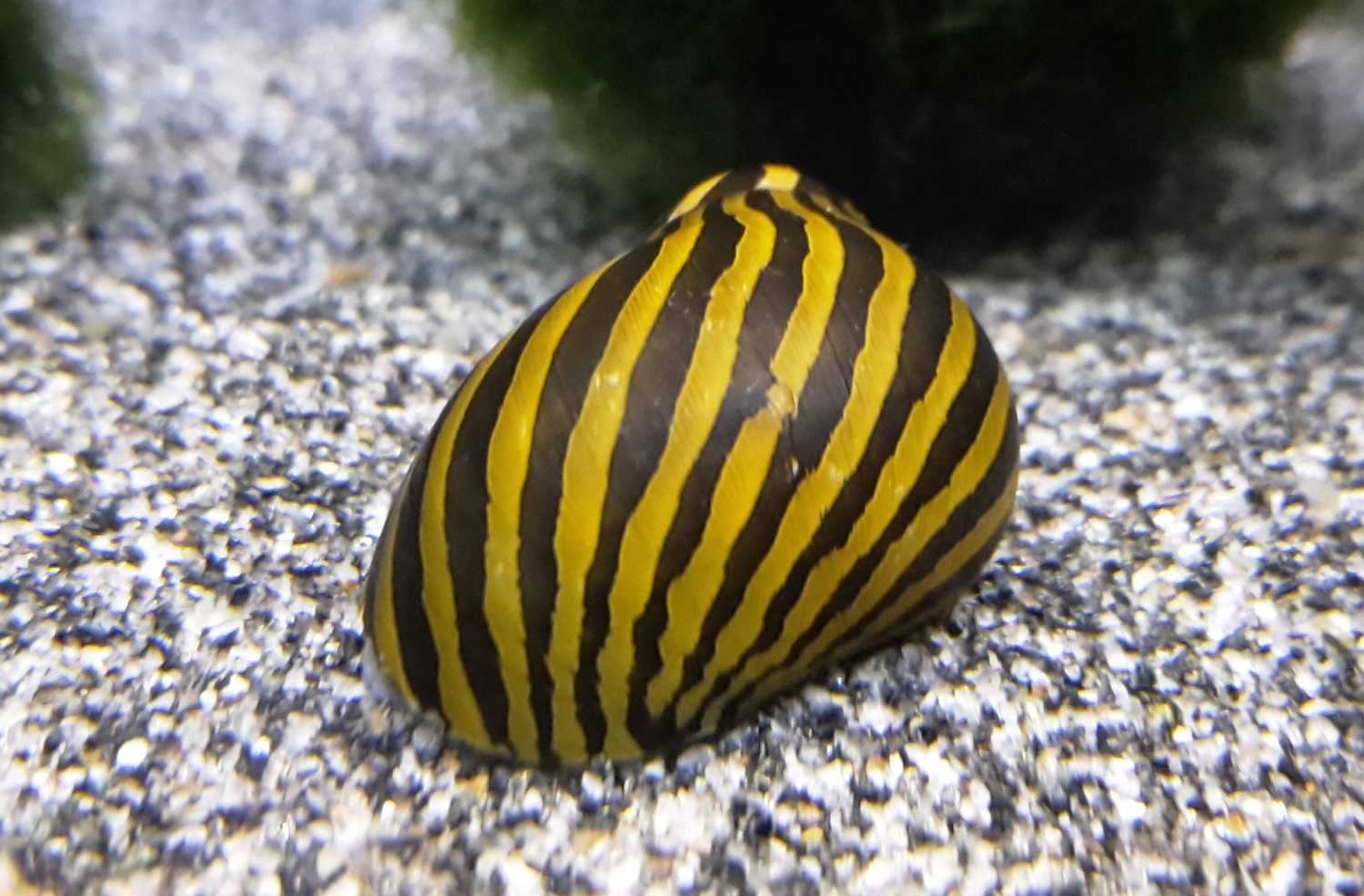 Видовое определение (Neritina natalensis zebra). Обычный вид улиток, распространенный от Кении и Мозамбика до Сомали и южнее до ЮАР. Предпочитают солоноватые воды среди мангровых зарослей болота и лагун. Раковина крупная (2.5 – 3 см) желто – зеленого или желтовато-коричневого цвета с узором из широких черных изогнутых полос или наклонных штрихов. Можно сказать что это полосатая улитка.