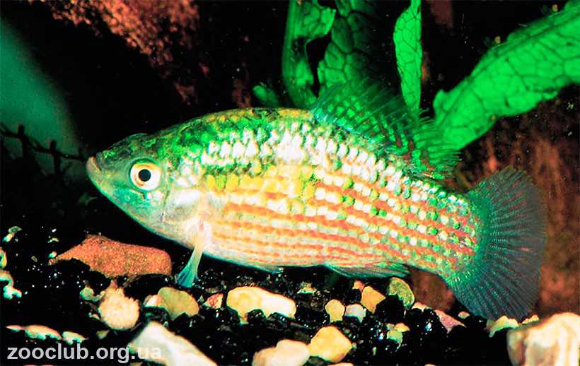 Молодые рыбы первые 2 месяца имеют одинаковый с самками окрас независимо от своей половой принадлежности. Потом у самцов исчезает характерное темное пятно на спинном плавнике.