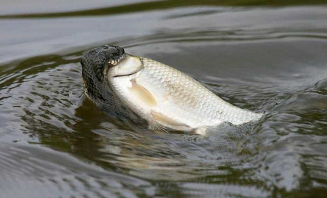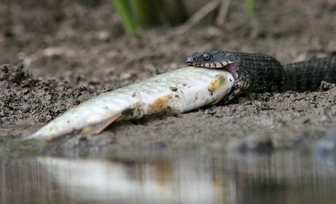 Мелкую рыбу ужи глотают на месте, а крупную тащат на берег — для проглатывания больших объектов им нужна твёрдая почва под брюхом