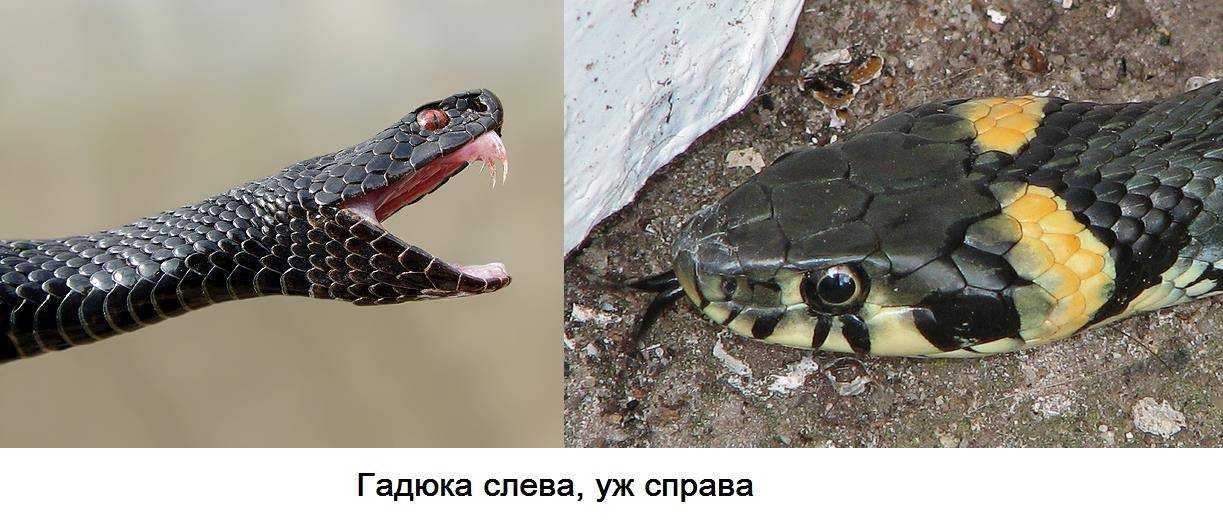 - Гадюки отличаются от ужей треугольной формой черепа с четко обозначенными надбровными дугами, у ужей череп овально-яйцевидной формы.