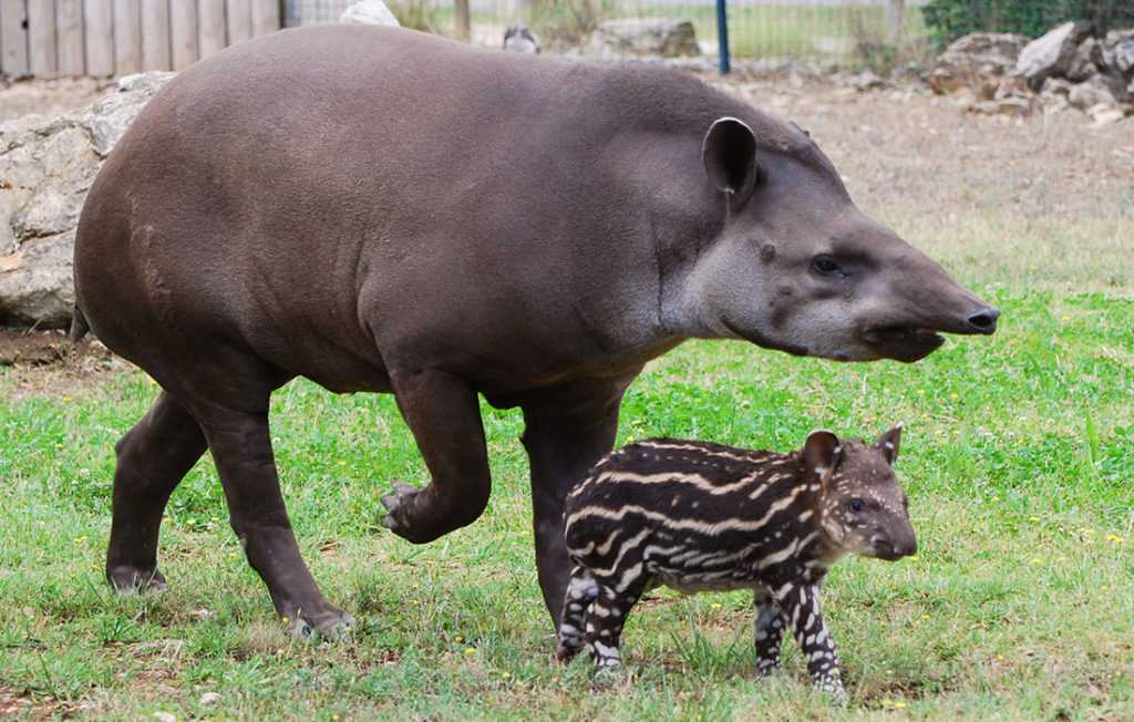 Малайский тапир, он же чепрачный тапир – является наиболее крупным в своем роде. Длина тела малайского тапира достигает 2.5 м, а масса тела до 300 кг. Окраска у этого вида необычная – черно белая. Молодые тапиры, как и другие виды тапиров в юности имеют полосатый окрас. Только к 5-ти месячному возрасту полоски исчезают и животное приобретает черно-белый окрас.