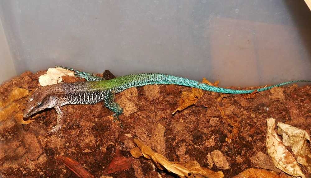 In the wild, Green Ameivas live on the forest floor, often seeking shelter in fallen leaves and under logs. This lizard likes having plenty of space so you must provide a pet Ameiva with a good-sized tank. Since this animal is terrestrial, it spends most of its time when awake on the floor of a tank so a longer tank is better than one that’s tall.