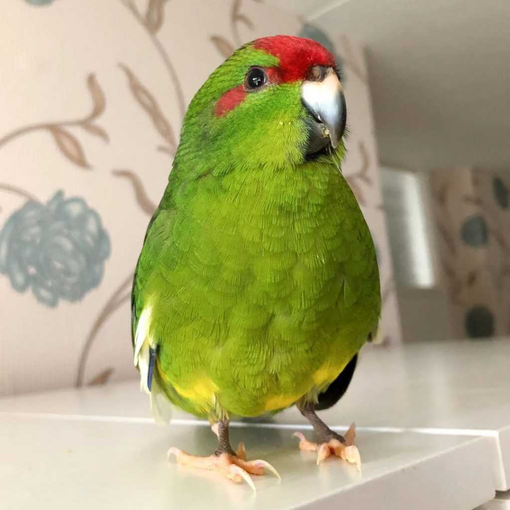 - Краснолобый прыгающий попугай (лат. Cyanoramphus novaezelandiae) — самый популярный какарик для содержания в неволе. Основной цвет оперения — темно-зеленый, но в ходе мутации птица поменяла окрас на ярко-желтый. Фото именно этой разновидности попугая с измененной расцветкой чаще всего можно найти в интернете. Шапочка на голове и горизонтальная полоска красного цвета, пересекающая глаза, характерны для «новозеландцев» с обеими вариантами расцветки. У попугая с природным зеленым окрасом синее подхвостье, такого же цвета окантовка контурных и маховых перьев.Краснолобые прыгающие попугаи