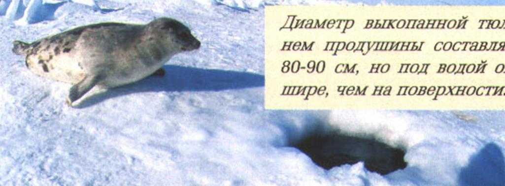 Диаметр выкопанной тюленем продушины составляет 80-90 см, но под водой она шире, чем на поверхности.
