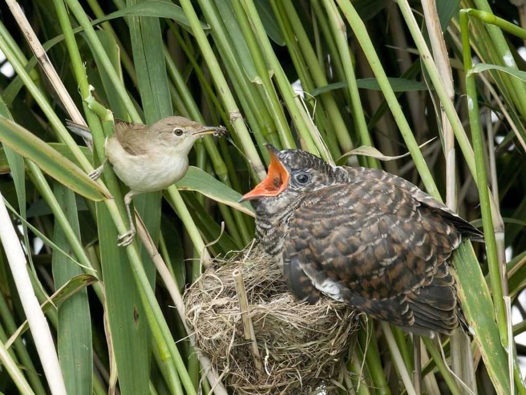 Болотная камышовка кормит гораздо более крупного цыпленка кукушки. (Изображение предоставлено: Getty)