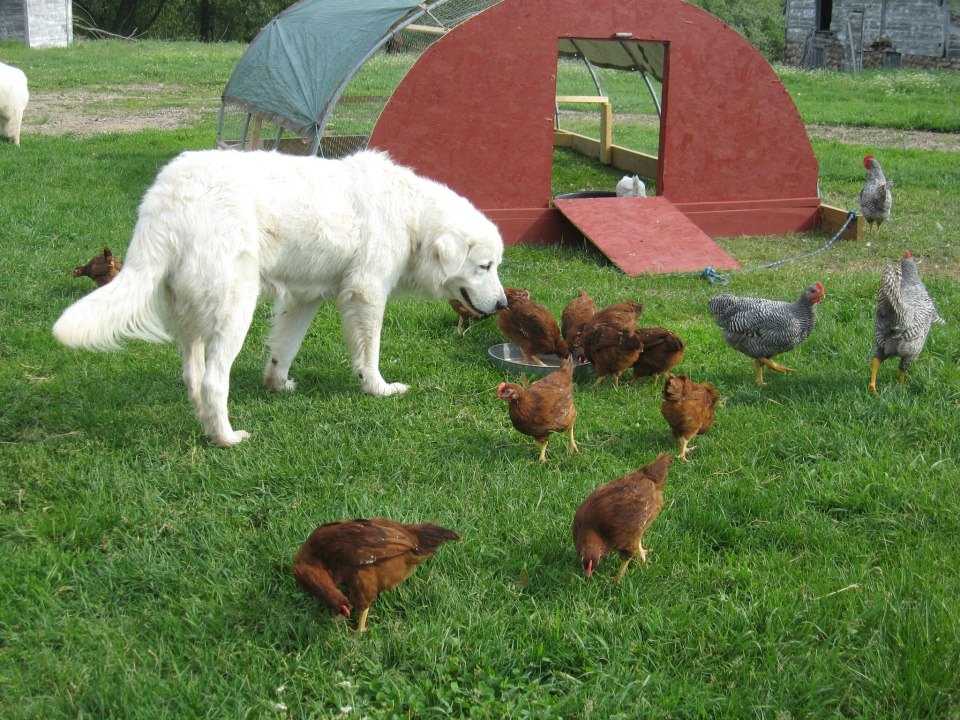 Собака охраняет курей.