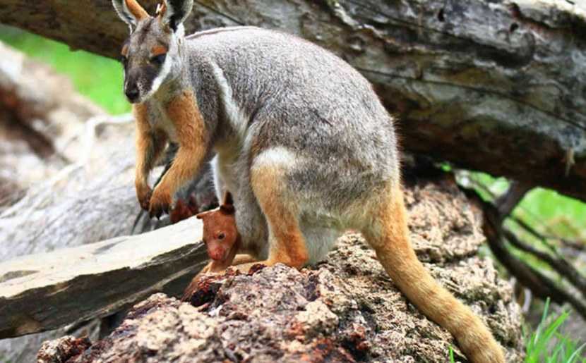 Он же обыкновенный валлару. От других своих сородичей отличается могучими плечами и более короткими задними конечностями и массивным телосложением. Обитает в скальных районах Австралии. Имеет длину тела – 1,5 м, и средний вес – 35 кг. Цвет шерсти этого кенгуру темно-бурый у самцов, а у самок чуть более светлый.