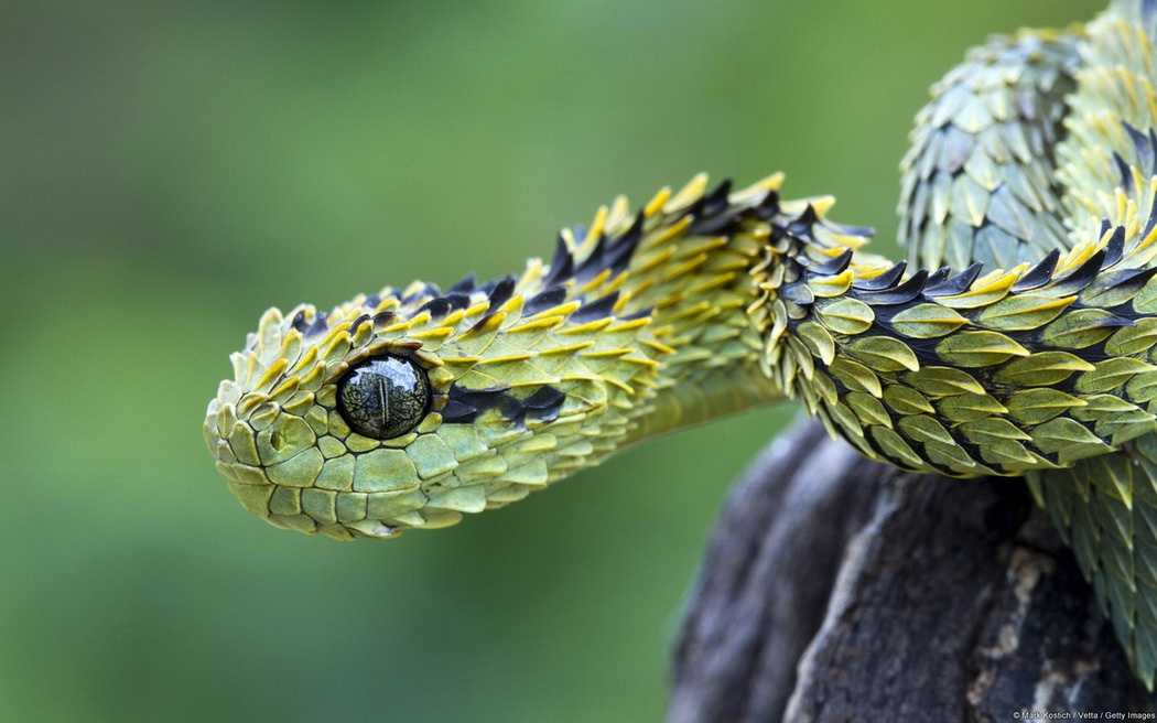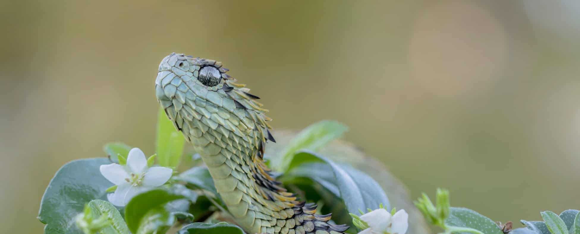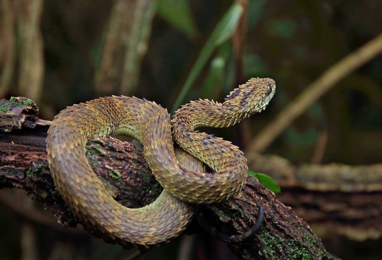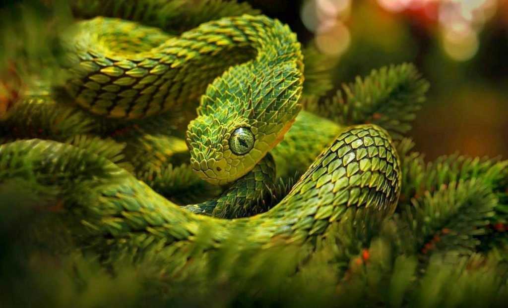 Шершавая древесная гадюка имеет кожу зеленого цвета и почти не выделяется на фоне зеленой листвы деревьев