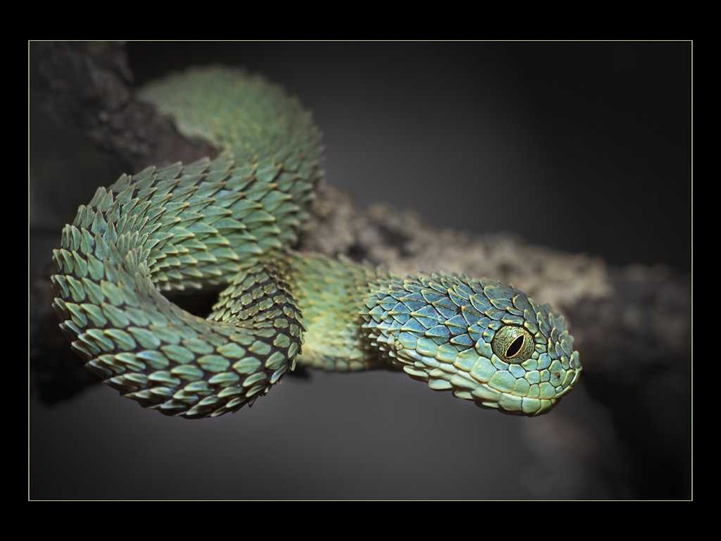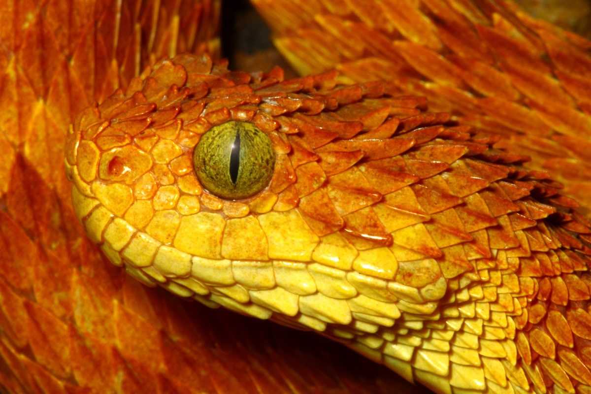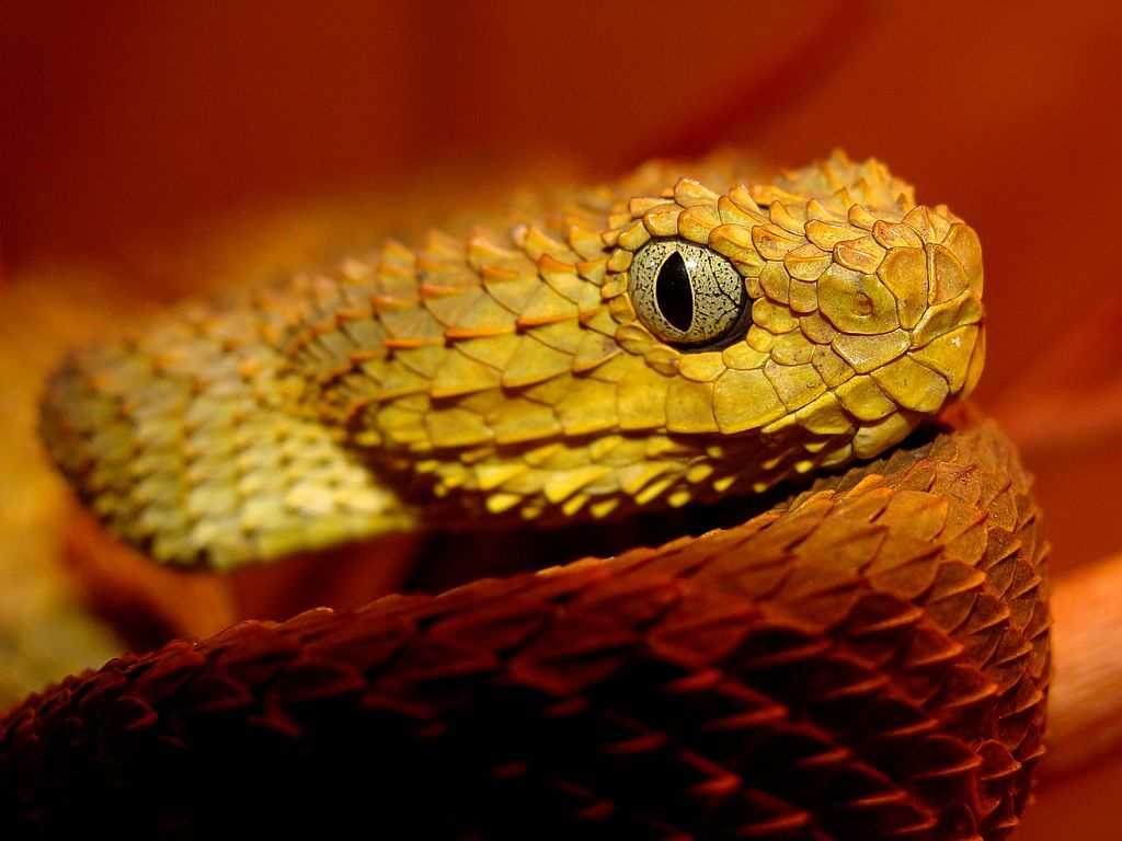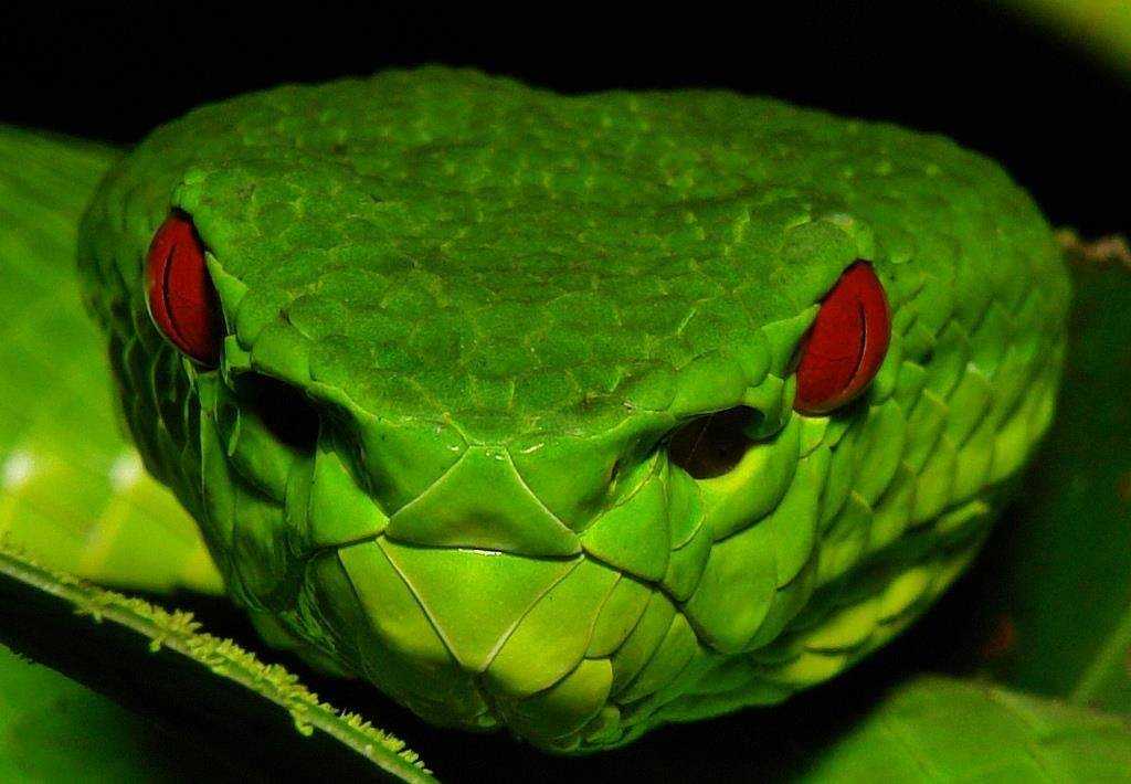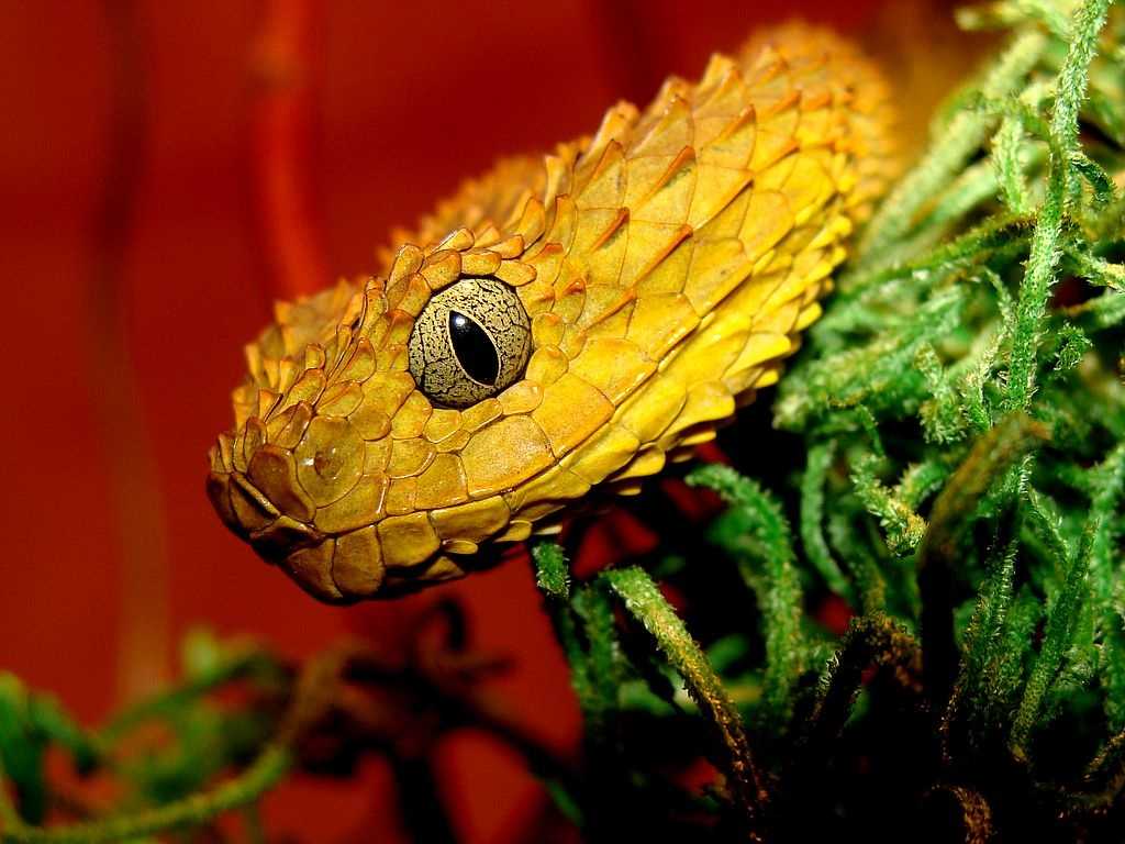 5. Гадюка-носорог. Верхняя часть тела яркой, красивой рептилии покрыта разнообразными геометрическими фигурами, окрашенными в 15 оттенков красного, синего, зелёного, жёлтого. Брюхо серого цвета с черными вкраплениями.