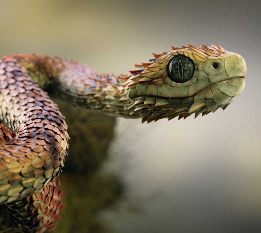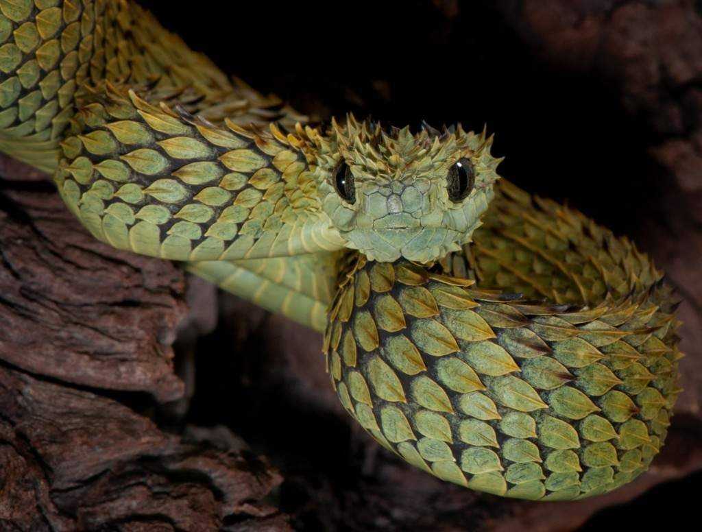 Эту змею прозвали древесной пернатой гадюкой. Действительно рептилия выглядит почти пушистой на вид. Род Atheris объединяет около 7- 9 видов древесных гадюк.