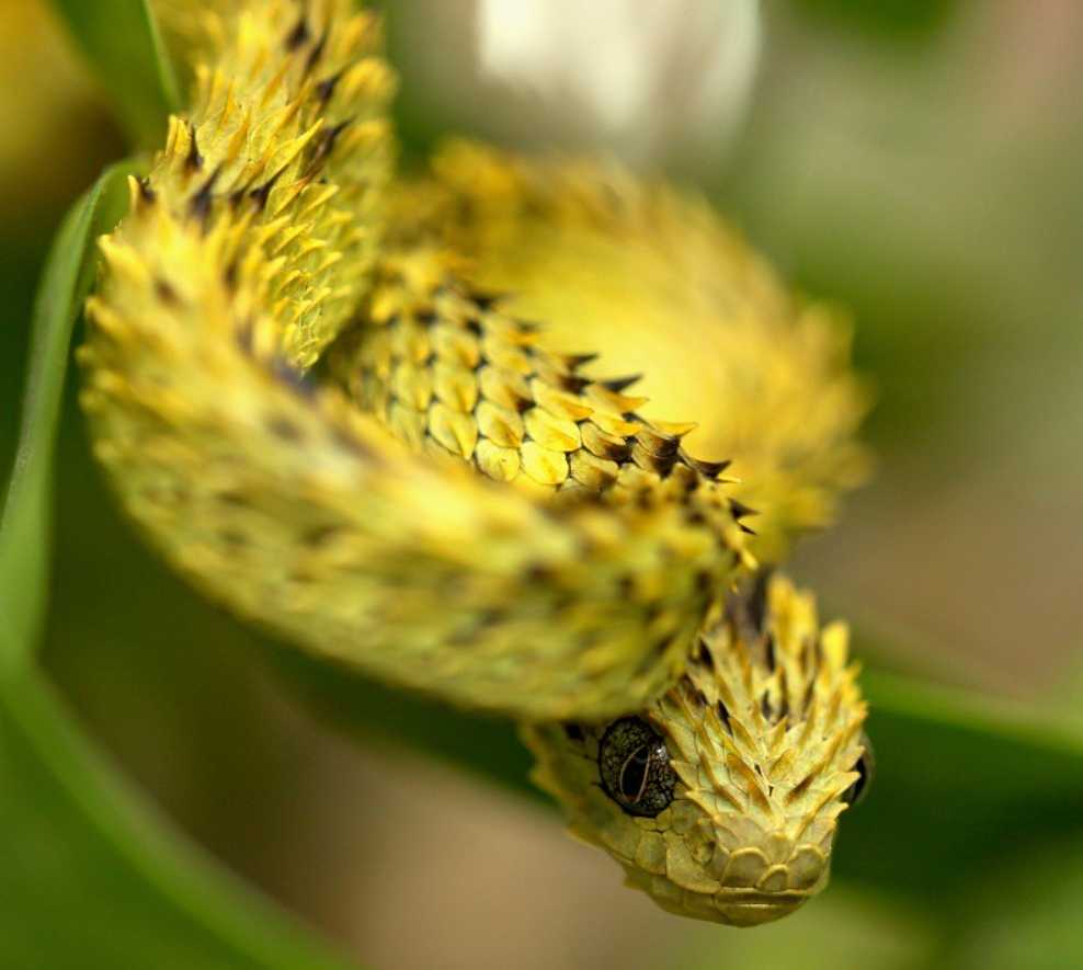 Окраска колючих кустарниковых гадюк соответствует фону окружающей среды и маскирует рептилий, помогая оставаться им малозаметными в кронах деревьев.