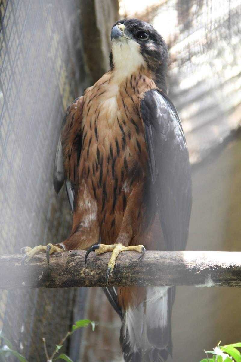 Вес маленького орла не превышает 2 кг, а рост взрослой особи может достигать 65 см. Цвет перьев светло-коричневый.