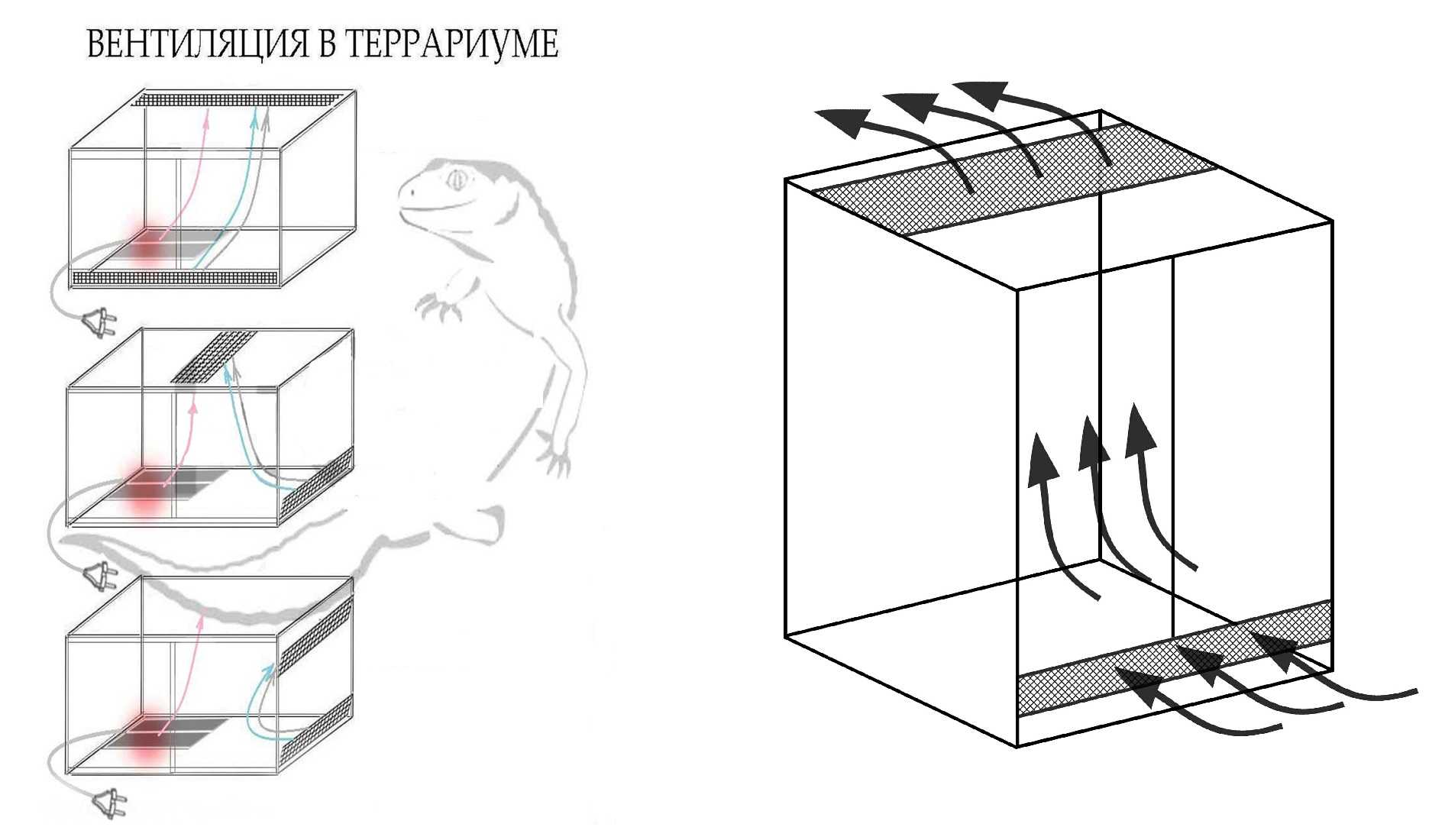 Вентиляция должна быть боковой. Один ряд отверстий располагают в верхней части боковой стенки, другой ряд в нижней части противоположной стенки. Такое расположение вентиляционных отверстий позволяет полностью проветривать террариум и при этом дольше сохранять высокий уровень влажности.
