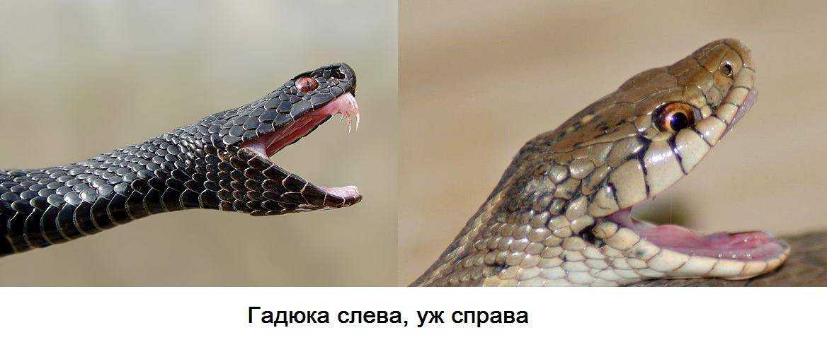 - Гадюки отличаются от ужей треугольной формой черепа с четко обозначенными надбровными дугами, у ужей череп овально-яйцевидной формы.