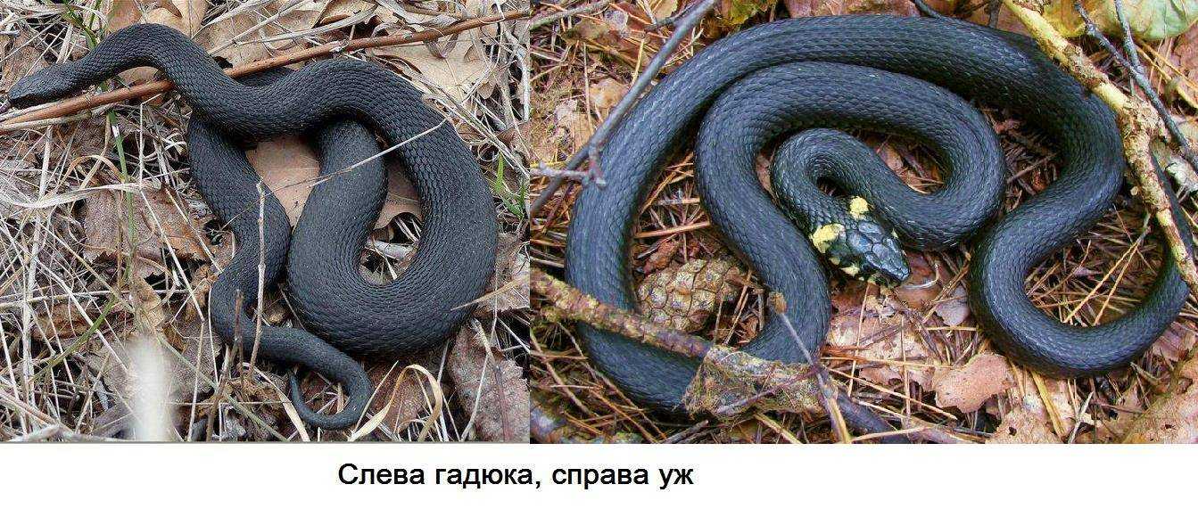 Внешний вид ужа и черной гадюки различается, несмотря на одинаковый цвет кожи. У обыкновенного ужа есть 2 желтых или оранжевых пятна на голове, похожих на миниатюрные ушки, а у гадюки такие отметины отсутствуют.