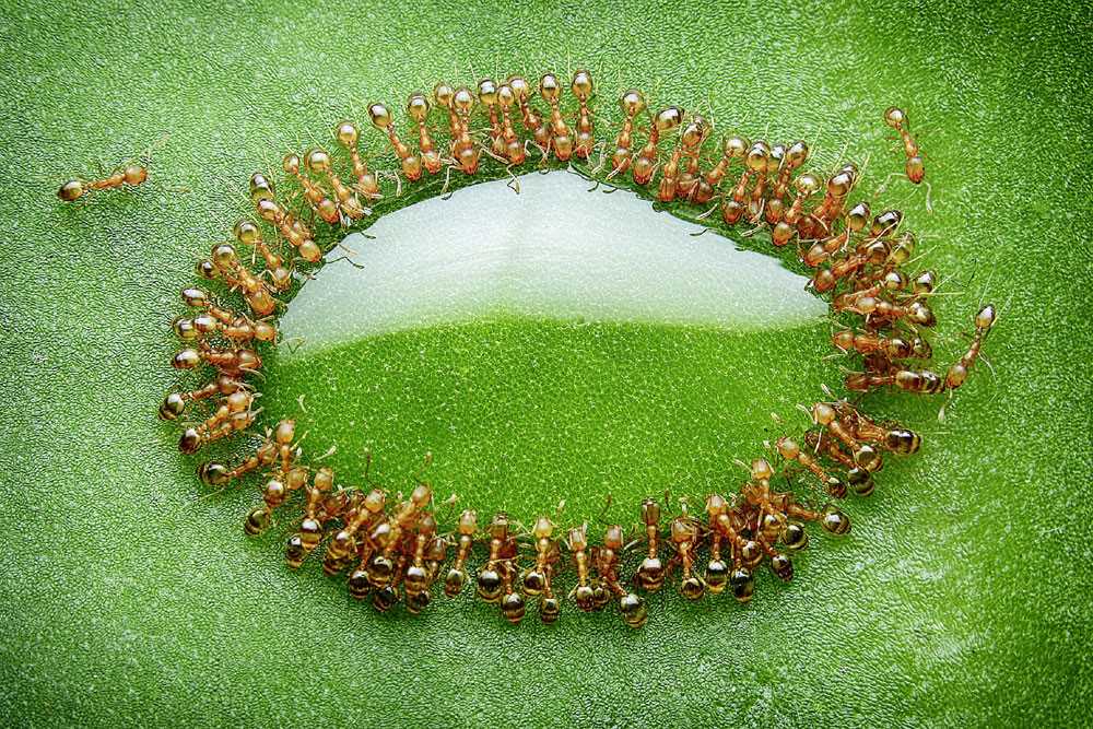 После обнаружения капли меда уже через полчаса сотни муравьев организовали живую цепь для переноски его в муравейник